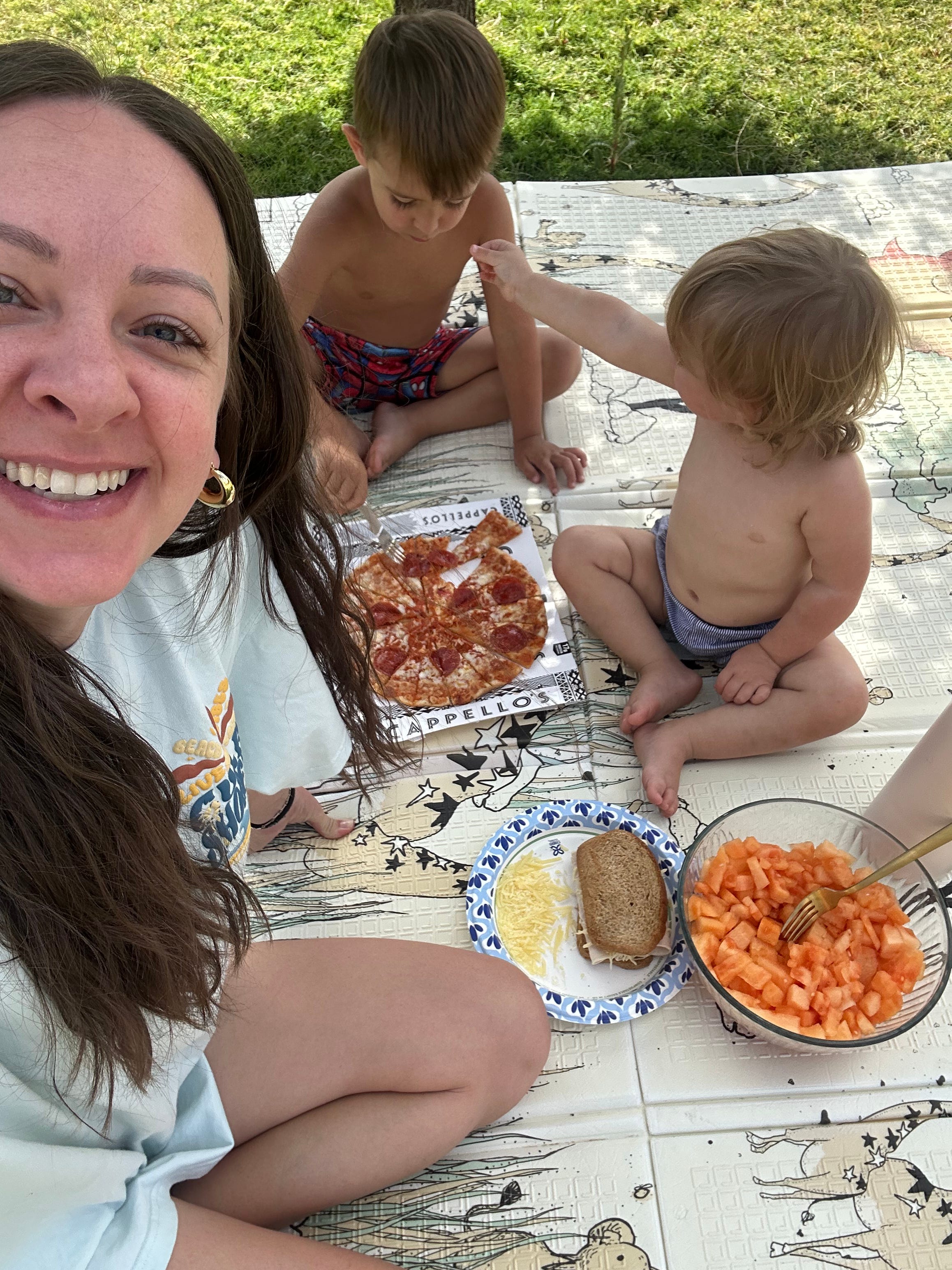 It’s was beautiful outside today. I laid down a mat in the shade of the tree for our picnic outside for lunch. Because the table was a mess and I refused to clean it. We ate sandwiches and chips and watermelon and pizza. We waved at people passing by, and found alligators in the clouds. We laughed, and played, and were here.